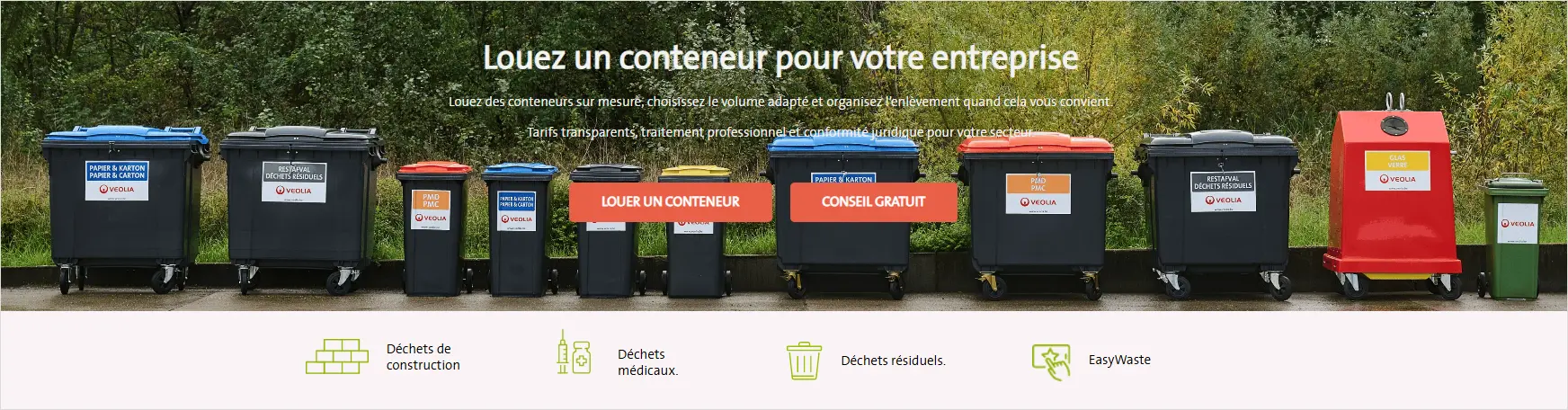 Le webshop est rattaché à la division gestion des déchets de Veolia, qui représente 65% du chiffre d’affaires de l’entreprise. Pour le segment des petites et moyennes entreprises, shop.veolia.be est la source principale de leads. L’optimisation de la conversion a donc un impact direct sur ses revenus.