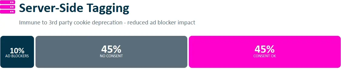 Le server-side déplace en grande partie l’exécution sur votre serveur. Trois bénéfices : les adblockers ont moins de prise, les cookies deviennent first-party, et vous contrôlez ce qui est envoyé.